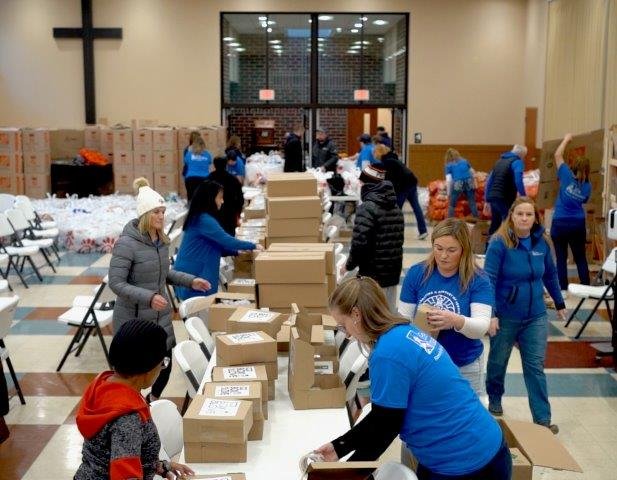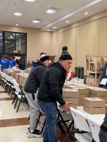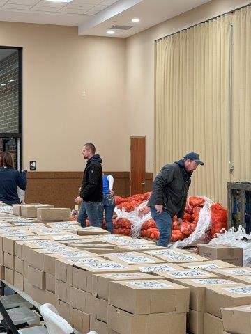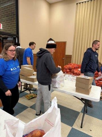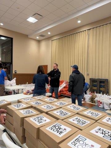 From 6 AM to 11 AM, our team members bundled up, rolled up their sleeves, and jumped into whatever jobs were needed. Some packed boxes filled with Thanksgiving meals. Others helped distribute those boxes to families in line. A few team members worked the kitchen area, pouring hot coffee and cocoa to keep the crowd warm. And several kept the line moving smoothly while offering encouragement, smiles, and even some entertainment to make the cold wait a little brighter.